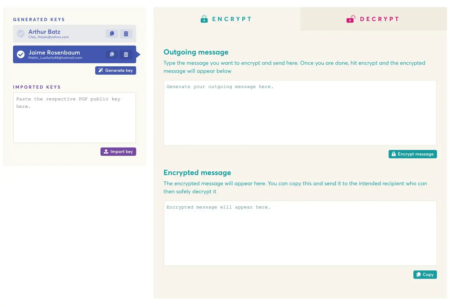 EncryptEasy is a simple and easy to use PGP encryption tool, managing all your and your contacts keys. Encryption should be simple. Developed with Wails.