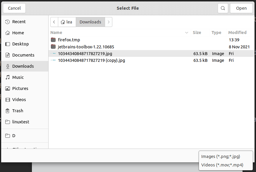 This will result in the Open File dialog using *.png,*.jpg,*.mov,*.mp4 as a filter.