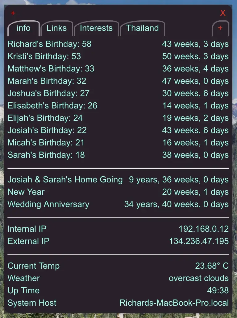 ScriptBarは、スクリプトまたはNode-Redサーバの出力を表示するためのプログラムです。 EmailItプログラムで定義されたプログラムを実行し、出力を表示します。 xBarやTextBarのスクリプトも使用できますが、現時点ではTextBarのスクリプトが正常に動作します。 また、システム上にスクリプトの出力を表示できます。 ScriptBarはそれらの情報をメニューバーには表示させず、簡単に参照できる便利なウィンドウ上に表示されます 。 複数のタブを使用して、様々な情報を表示できます。 よくアクセスするWebサイトへのリンクを配置することもできます。